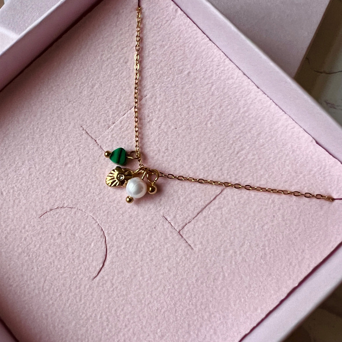 18k guldpläterat halsband med malakit och sötvattenspärla.