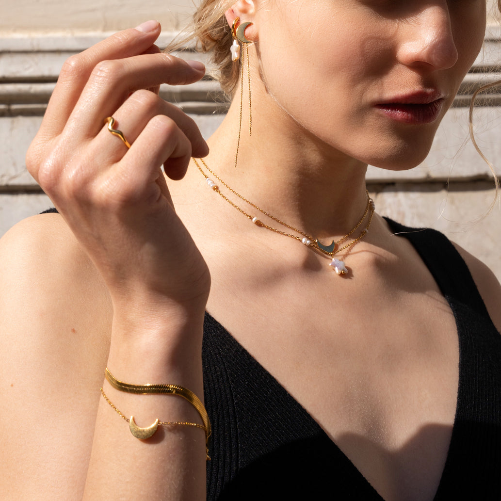18 karat guldbelagt stål - Smykket er allergivenlig, nikkelfri og blyfri, jf. dansk lovgivning. Smykket er vandfast